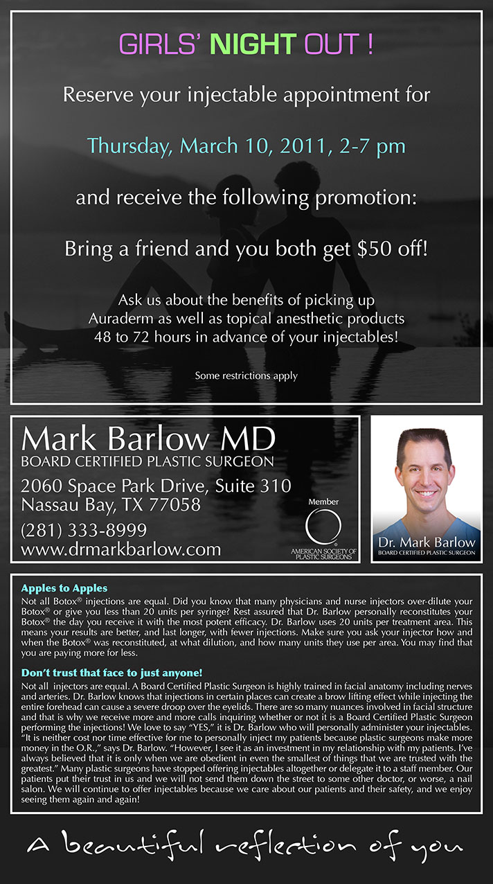Mark Barlow, M.D., P.A. is located at 2060 Space Park Drive, Suite 310, Nassau Bay, Texas. For more information you may contact our office at (281) 333-8999 or visit our web site directly at www.drmarkbarlow.com. Copyright © 2011 Mark Barlow MD. All rights reserved. |